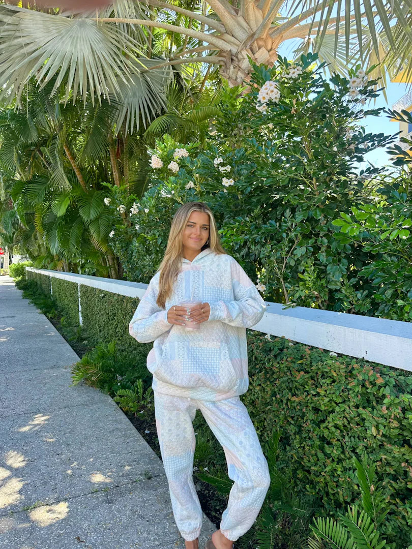 Nela is wearing a size Large in this hoodie and Medium in the pants.