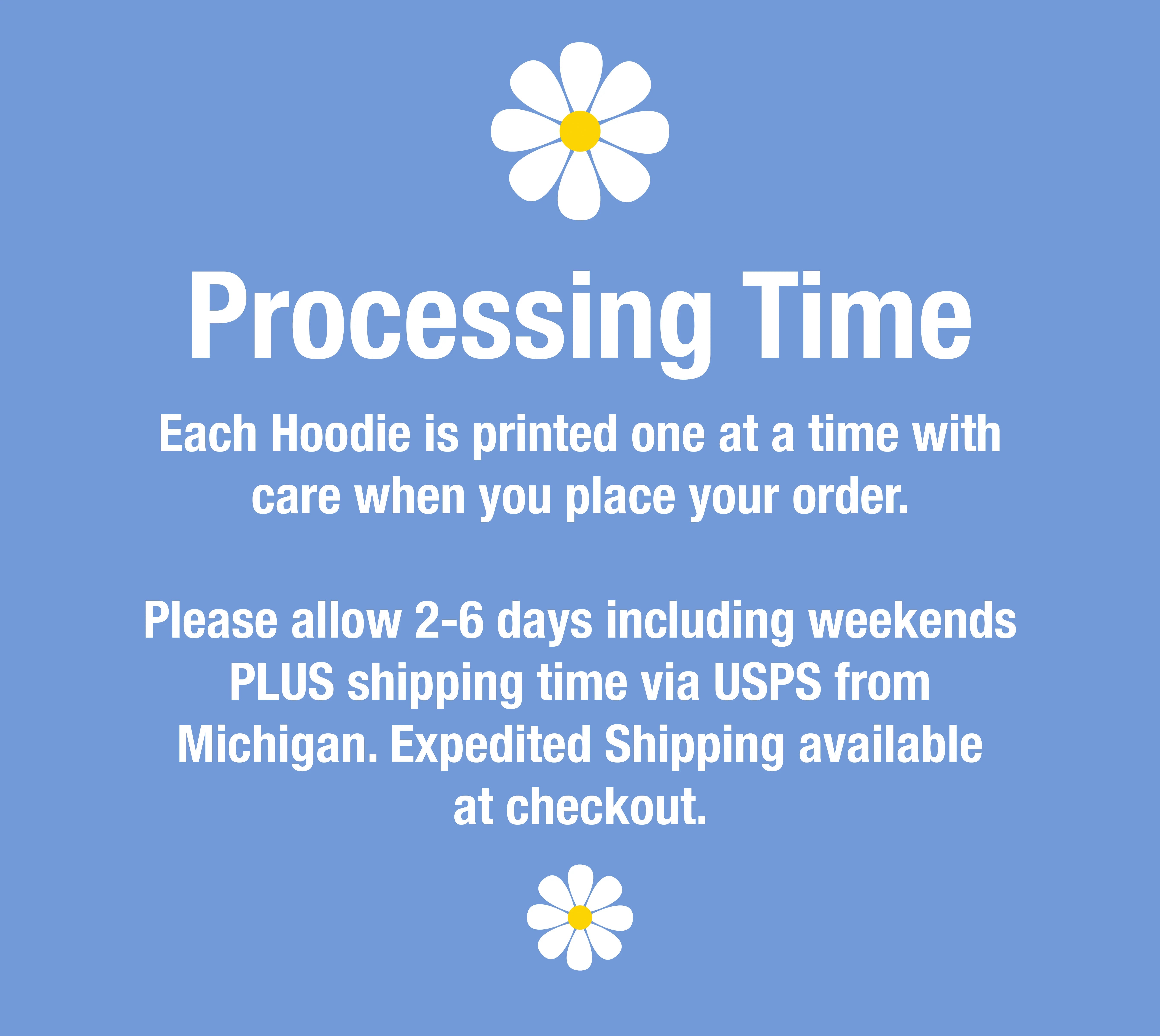 PROCESSING TIME: Each hoodie is printed individually with care after you order. Please allow 2-6 days for production, plus shipping time from Michigan via USPS. Faster expedited shipping options are available at checkout.