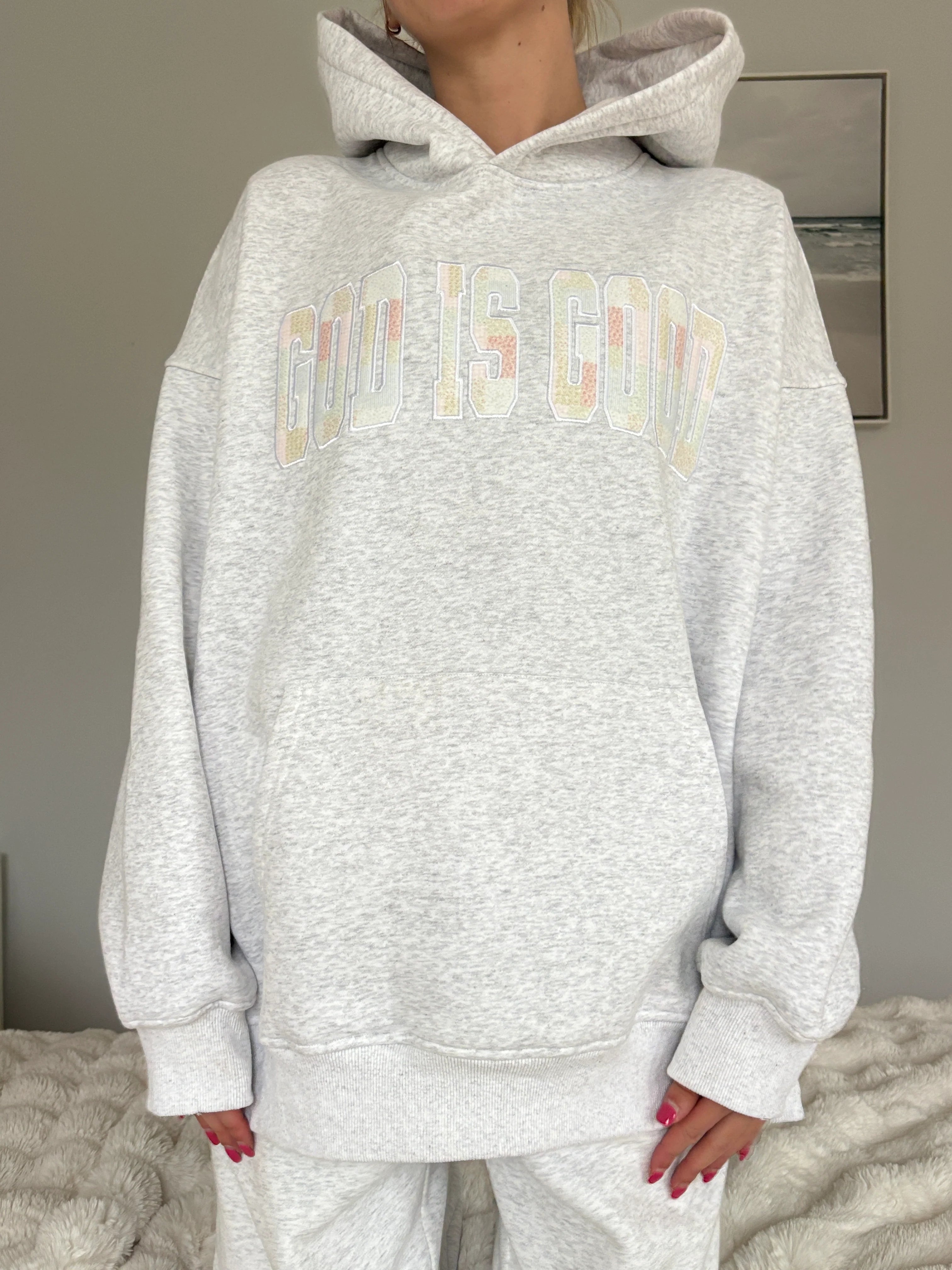 In these photos, Nela is wearing a size Large for a classic oversized fit.